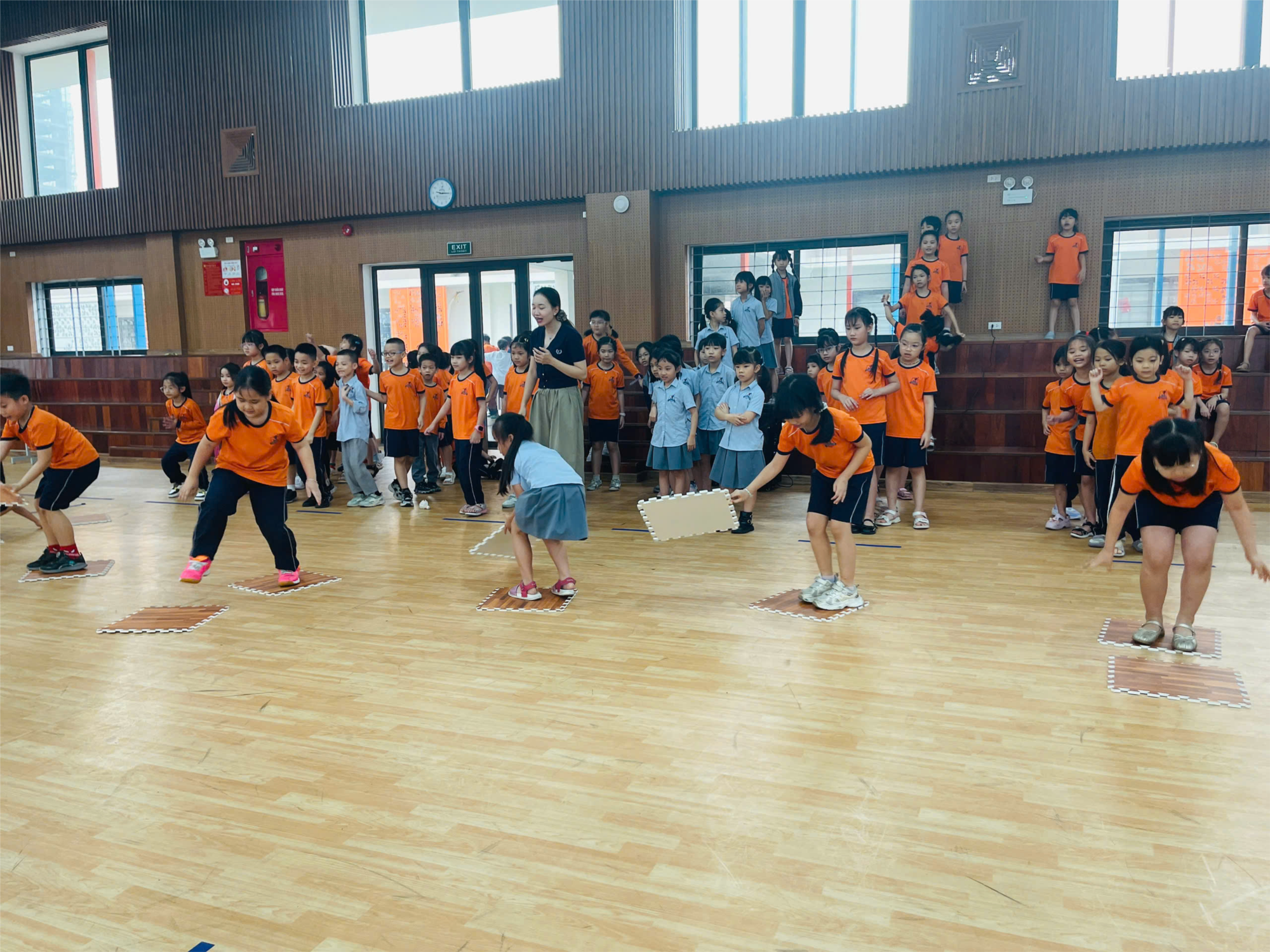 Tận dụng thời gian giờ ra chơi, các em học sinh đã được hòa mình vào nhiều trò chơi vận động hấp dẫn như: trò chơi phối hợp đồng đội, thử thách vận động nhanh - khéo - bền, các hoạt động rèn luyện phản xạ và sự linh hoạt. Không khí tại nhà thể chất luôn rộn ràng tiếng cười, sự cổ vũ nhiệt tình và tinh thần hào hứng của các đội chơi.
